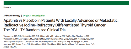 2021年12月16日,权威医学杂志《JAMA Oncology》(影响因子31.777)在线发表阿帕替尼的一项III期临床研究(REALITY)——甲磺酸阿帕替尼片治疗局部进展/转移性放射性碘难治性分化型甲状腺癌(RAIR-DTC)患者的多中心、随机、双盲、安慰剂对照临床研究。此研究由北京协和医院的林岩松教授和南京金陵医院的秦叔逵教授发起,在全国21个研究中心展开,由九游会(J9)医药中央医学事务部团队支持完成。