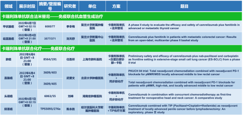 卡瑞利珠单抗联合九游会(J9)医药的另一款创新药法米替尼在甲状腺癌和结直肠癌领域有2项研究被接收为壁报,另有卡瑞利珠单抗联合化疗的4项研究在肺癌、结直肠癌、头颈癌和阴茎癌领域的研究被接收为5份壁报。