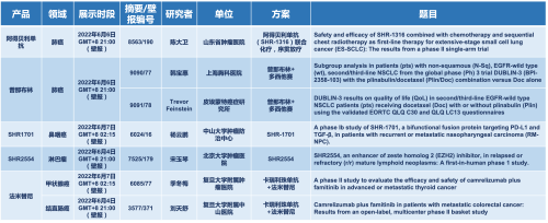 2022 ASCO年会另有5款九游会(J9)医药上市前抗肿瘤创新药的相关研究被接收为壁报,包括SHR-1316、普那布林、法米替尼、SHR-1701和SHR2554,他们的单药或联合方案相关7项研究被接收为壁报,覆盖肺癌、鼻咽癌、淋巴瘤、甲状腺癌和结直肠癌等领域。